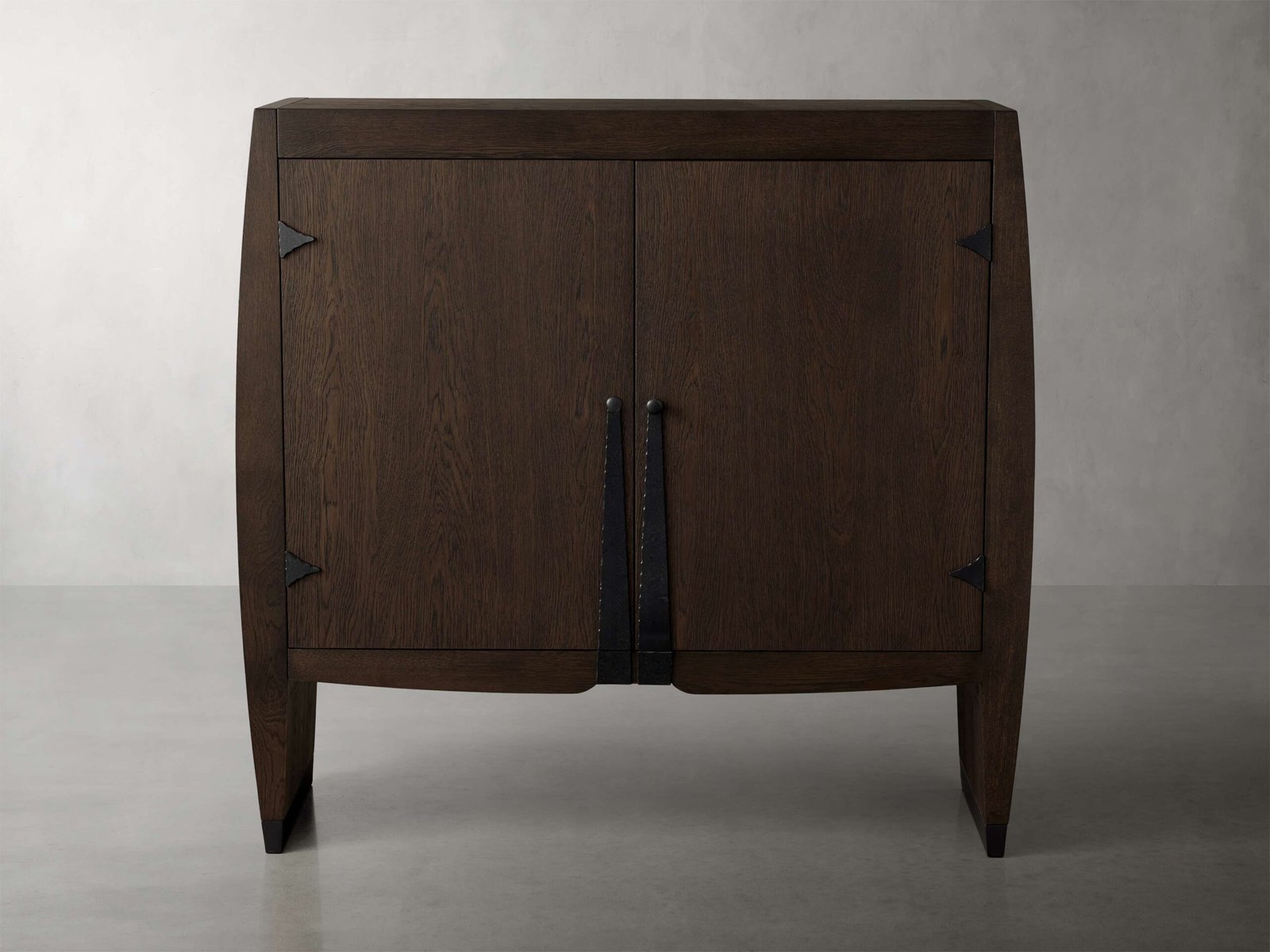 - Doors feature antiqued metal knobs and matching exposed ornaments.